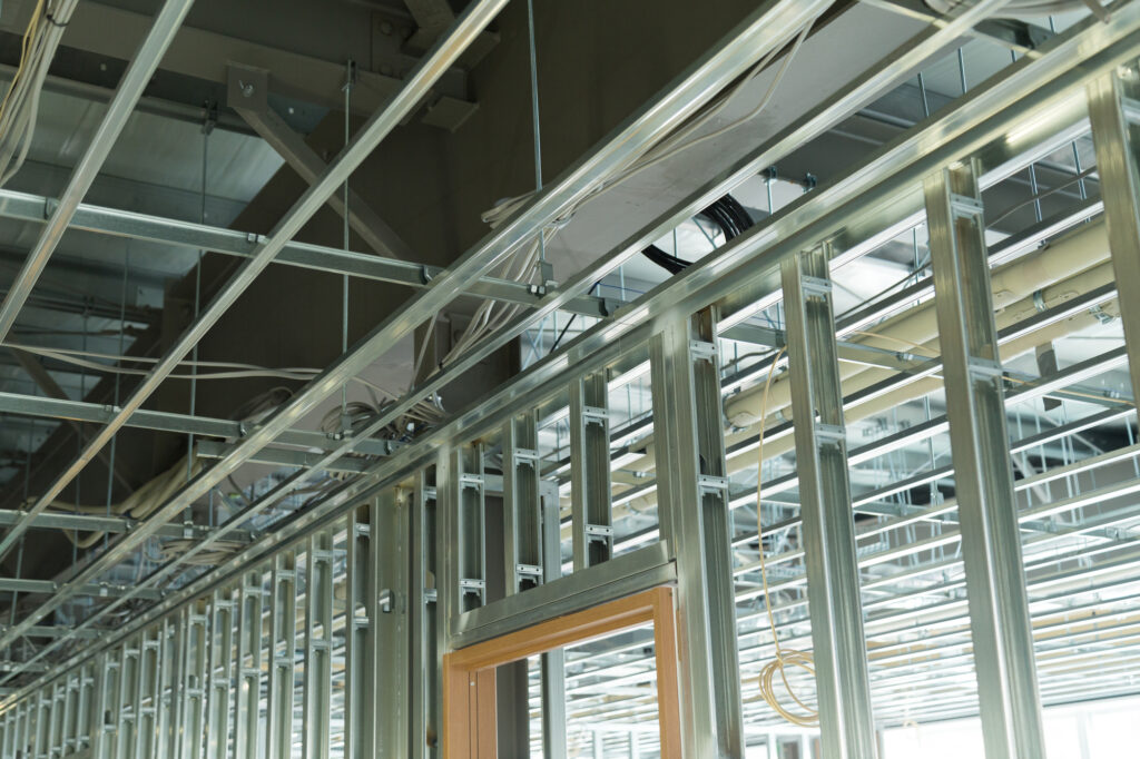 まず、LGSとよばれる軽量鉄骨を組合わせて骨組みをつくり、部屋を仕切る壁や(もちろん躯体の壁の上からも)天井に張り巡らせます。